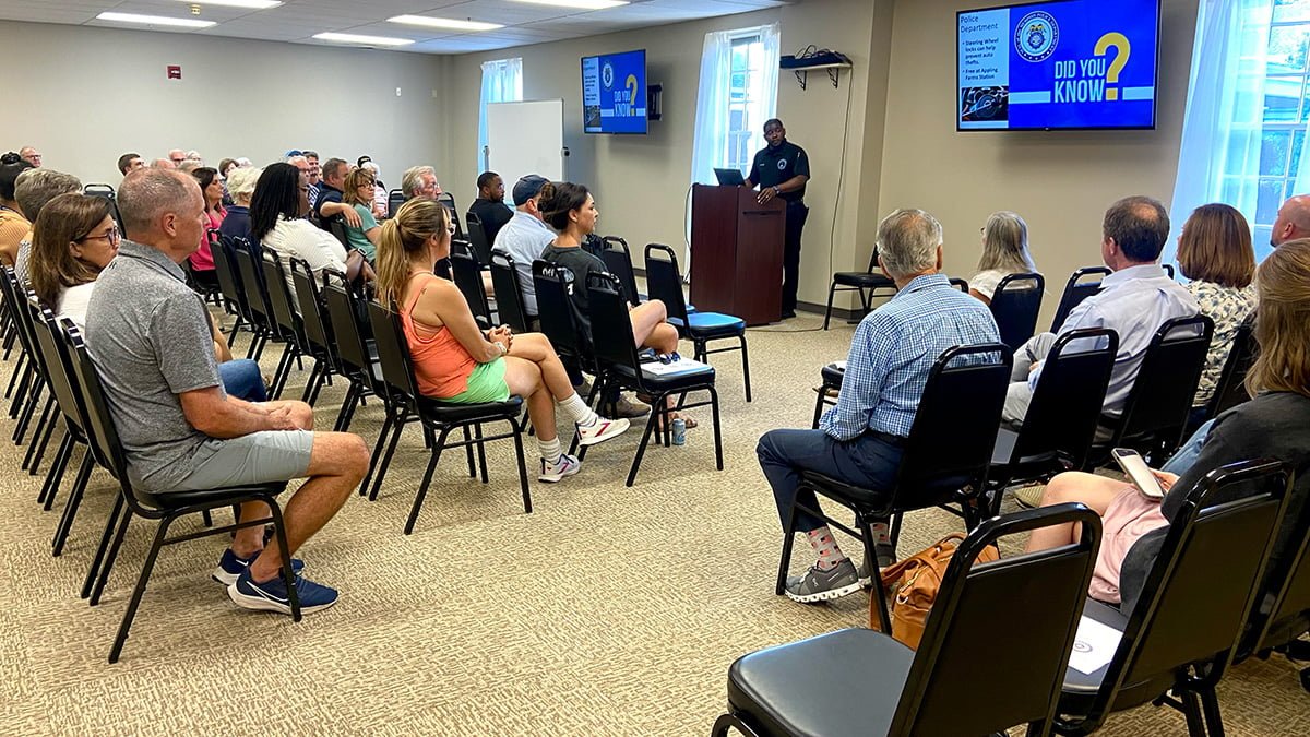 Officer Nigel Payne of the MPD Crisis Intervention Program and Interim Neighborhood Watch Manager, introduced Colonel Chris Moffatt, chief commander of the Appling Farms Station (the precinct that includes Avon Woods); MPD Neighborhood Watch Program Manager Danielle Boothe; Officer Dames, Neighborhood Watch Coordinator for the Tillman Precinct, and Officer Dewitt, who is new to the Appling Farms Precinct. Officer Payne presented an overview of the Appling Farms Precinct, a look at recent crime events in our area, and led a discussion of our area’s most common crimes — vehicle burglary and auto theft.