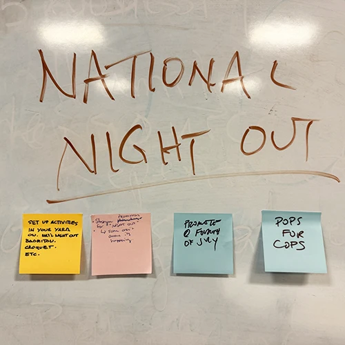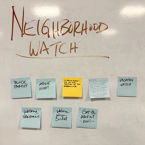 Neighbor Jay Perdue led a brainstorming session gathering ideas as to how we might leverage the Avon Woods Neighborhood Watch Group to curb crime in the area, how we might recruit more Block Captains, and how we might mark National Night Out (Aug. 5).